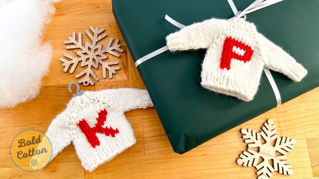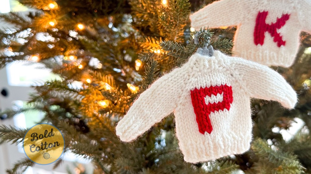 Last year for Christmas I made my family these teeny tiny little sweaters embroidered with the first letter of each person’s name on them. I added them to their gifts as gift tags and now they all use them as ornaments to hang on their trees, and now I have the free pattern ready for you to knit!